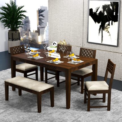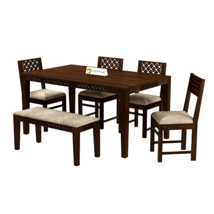 KendalWood™ Furniture Sheesham Wood CNC Cuting Dining Table with 4 Chairs with 1 Bench|6 Seater Dining Set- Dining Room Furniture (Finish Color:-Walnut Finish with Cream Cushion)