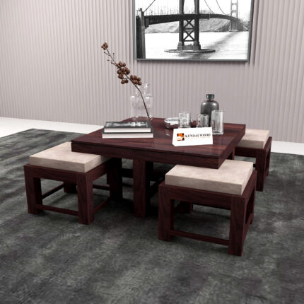 KendalWood™ Furniture Sheesham Wood Coffee Table | Center Table with 4 Stool | Finish Color:- Walnut Finish with Cream Cushion
