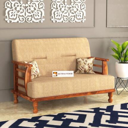 KendalWood™ Solid Wood 2 Seater Wooden Sofa Set for Living Room Furniture Fabric 2 Seater Sofa (Finish Color – Honey Finish with Cream Cushions)