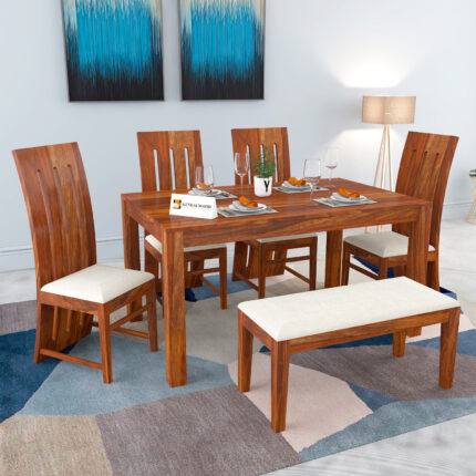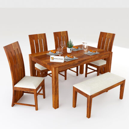 KendalWood Furniture Sheesham Wood Dining Table with 4 Chairs with 1 Bench|6 Seater Dining Set- Dining Room Furniture – Honey Teak Finish with Cream Cushions
